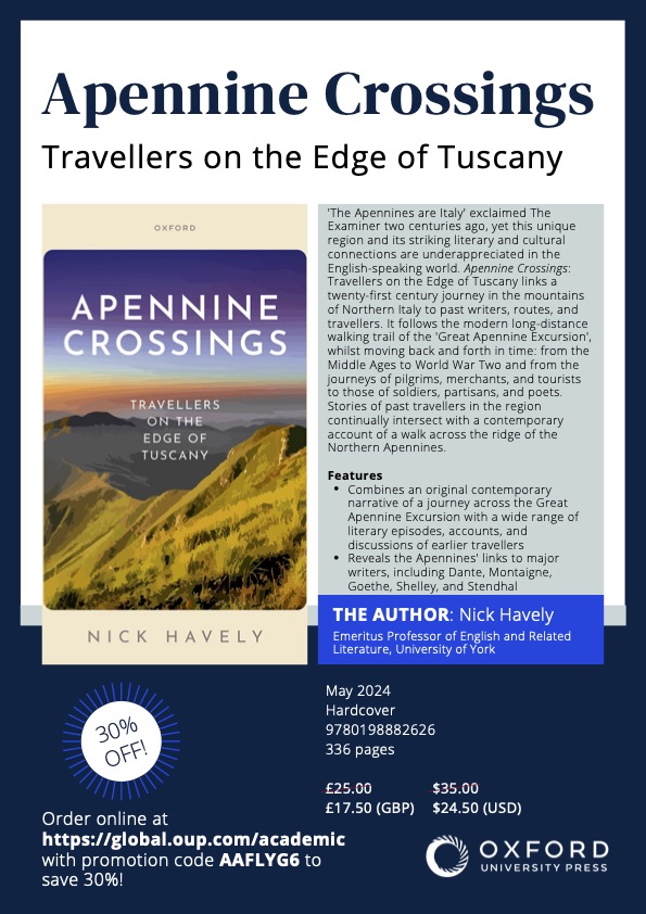 The book with this title was published this year and links Nick Havely’s own twenty-first century journey across the Apennine crinale – the ridge between Tuscany and Emilia -Romagna – to those of pilgrims, tourists and combatants from the Middle Ages to the Second World War. His talk will introduce the route taken, some of the travellers who crossed it, their perceptions of the landscape, and the various problems and dangers that they and I encountered. It will be illustrated with images of Apennine locations and readings from the book.